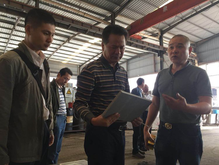 闽泉山公司吕青山总经理引领担保公司王治平董事长及随行人员参观石材仓库、加工厂等。