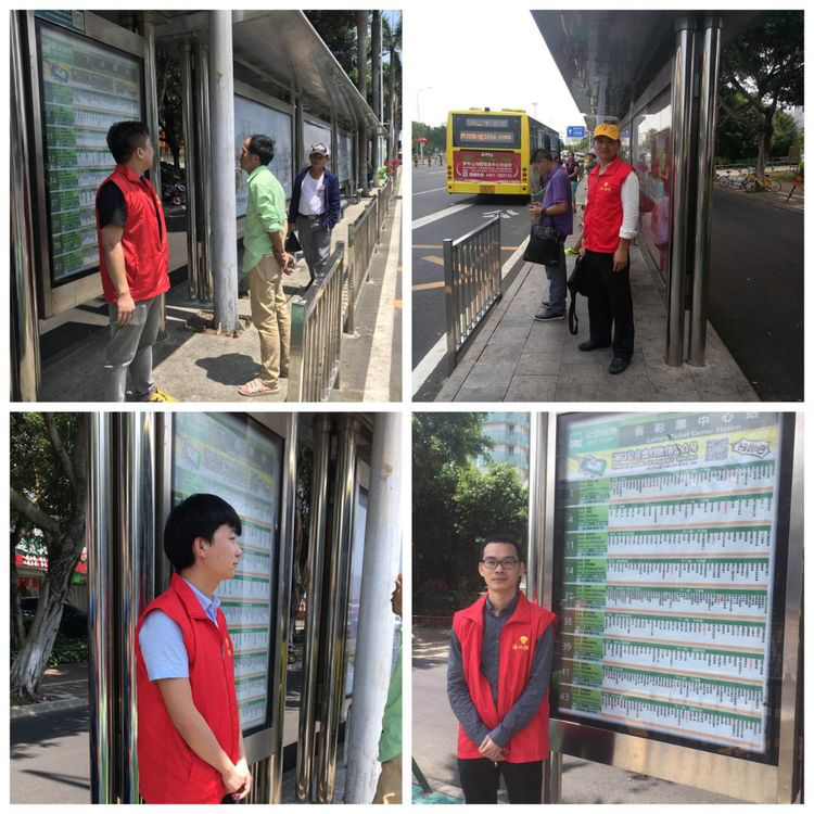 本此次志愿服务活动时间是早上7点30分到晚上20点,我司志愿者统一穿着公司红马甲,分为早中晚三班,在秀英—府城方向4个公交站点(依次为:省彩票中心站、国兴大道路口站、东站、五公祠站),每班每个站点2名志愿者。