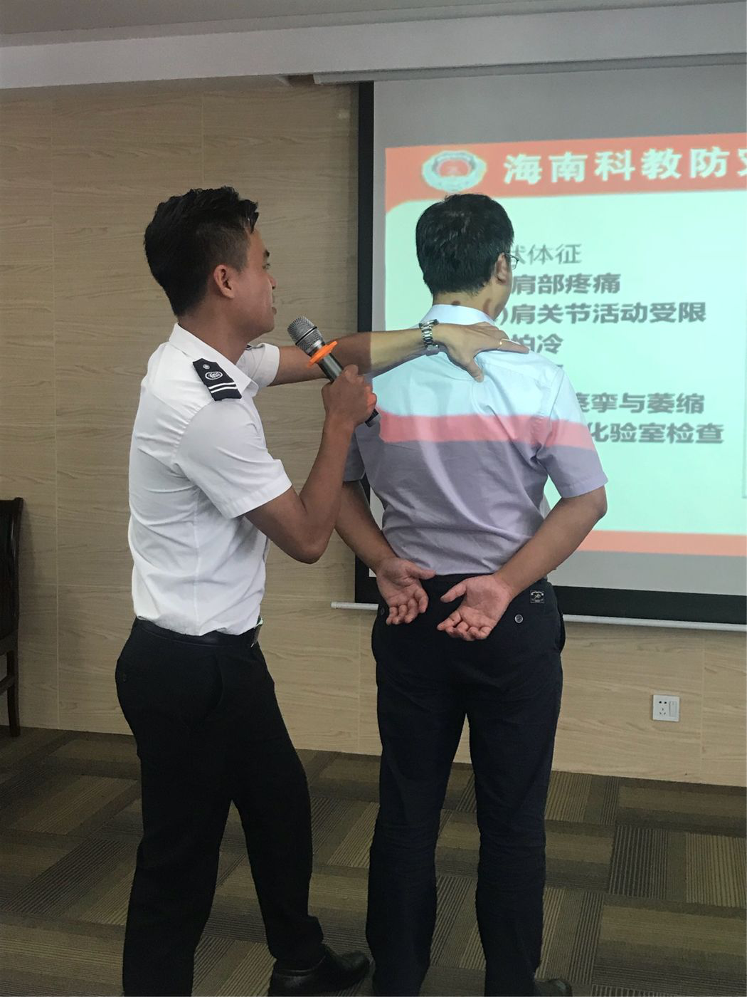 陈教官根据公司实际,结合图片、案例,生动形象地讲解常见职业病危害因素及职业病防治方法等相关知识。针对办公室工作常见的职业病肩周炎和颈椎病的预防,陈教官进行了详细的讲解和模拟示范,参加培训人员现场参与互动,气氛活跃。