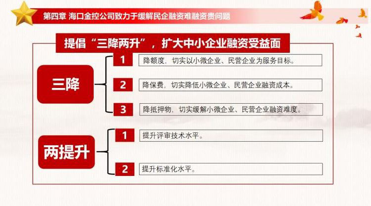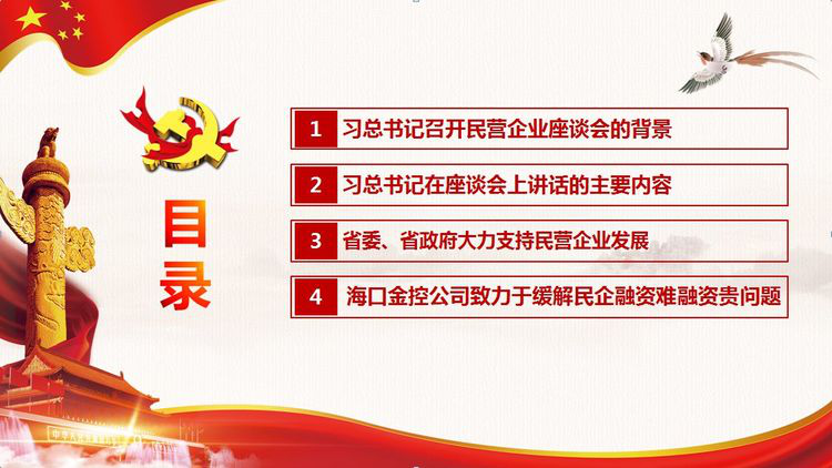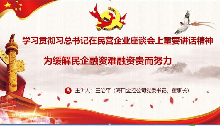 本次讲课内容针对性高,专业性强,信息量大,互动性好。本次讲课,结合公司实际,通过全面学习习近平总书记在民营企业座谈会上的讲话精神,既能够从全国层面阐述了座谈会召开的背景,回顾了非公有制经济发展的历程、非公有制企业的重要地位和作用、民营企业发展遇到的困难和问题,以及解决民营企业融资难融资贵问题的对策等,又能够从海南层面讲述了我省民营企业发展的现状、推出的十项支持民营企业措施和解决融资难融资贵问题政策以及推出的40条进一步优化营商环境的新举措。同时,还总结海口金控公司15年来服务民营企业、服务小微企业过程中积累的宝贵经验,从协助省财政建设海南省融资担保平台;提倡“三降两升”,扩大中小企业融资受益面;加快金控引战混改,提升为民企综合金融服务能力等三个方面,全面阐述金控公司在破解民企融资难融资贵问题的新途径。同时着重强调要实现金控公司的可持续发展,实现金控改革目标的进程中加强党对国有企业领导的重要性。
