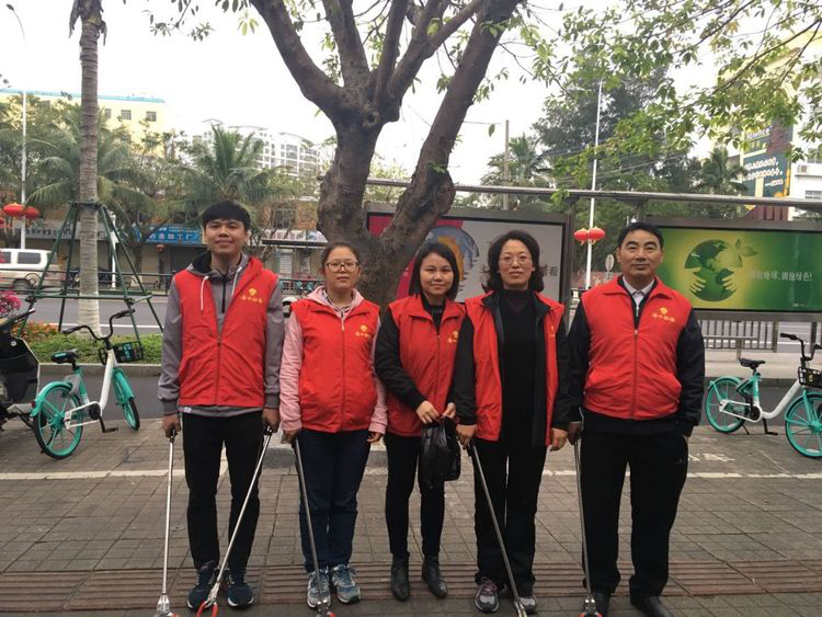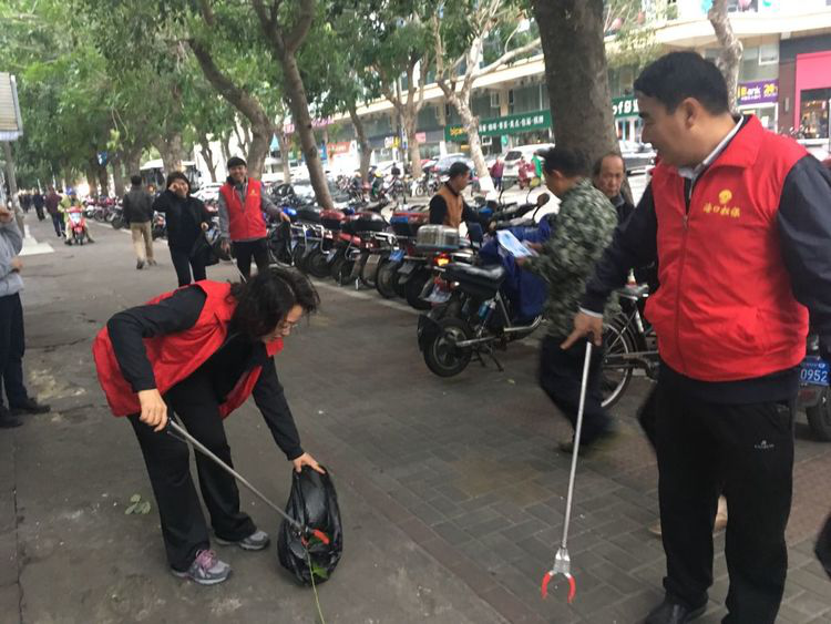 虽然今天有大风和小雨,但丝毫没有影响志愿者“创城”巡查工作的热情。图为党委副书记、纪委书记罗勤和党委委员李秀芬在捡拾垃圾。