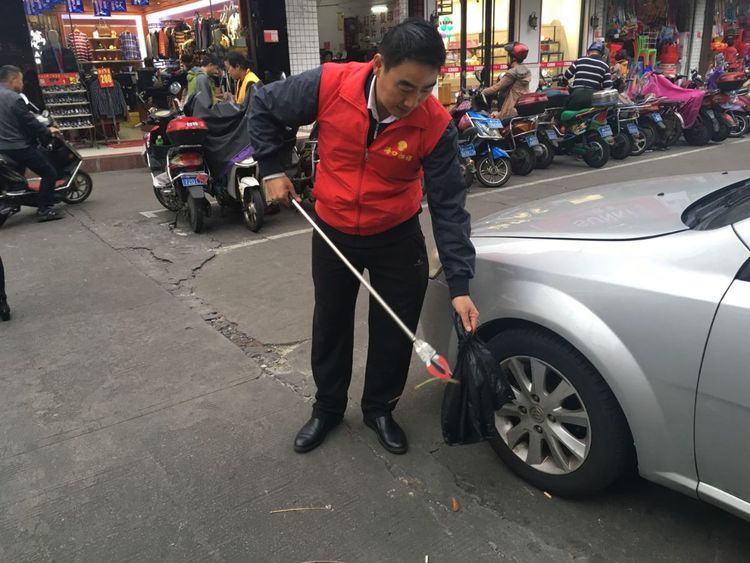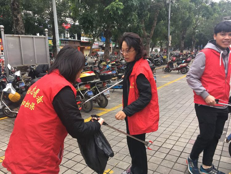 图为志愿者捡拾垃圾、整理电动自行车停放。