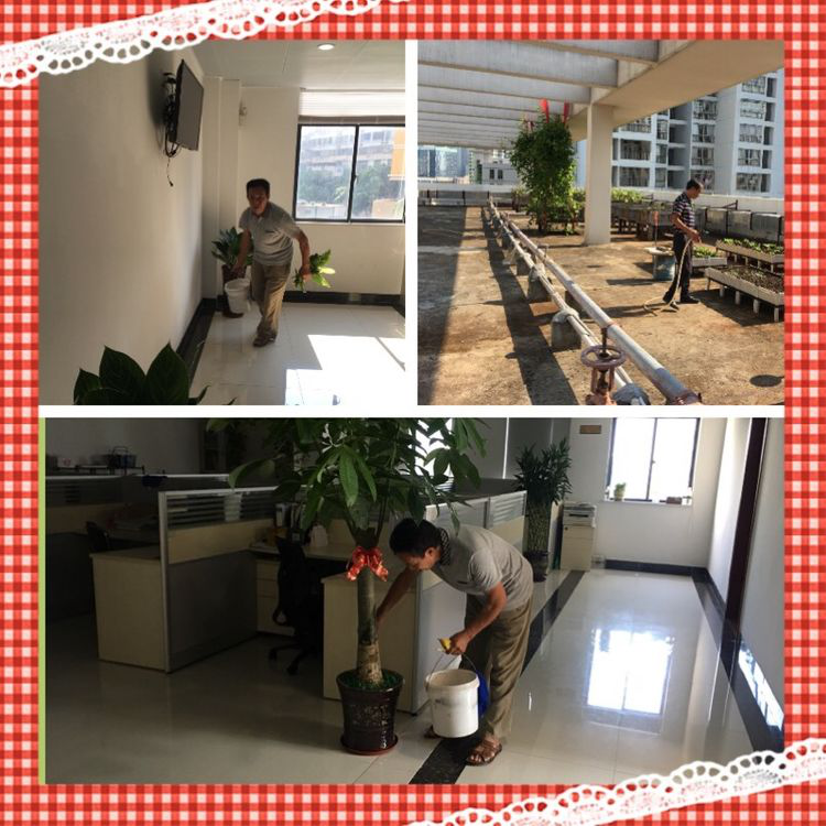 公司后勤人员正在清整环境卫生,给花草补给水分。